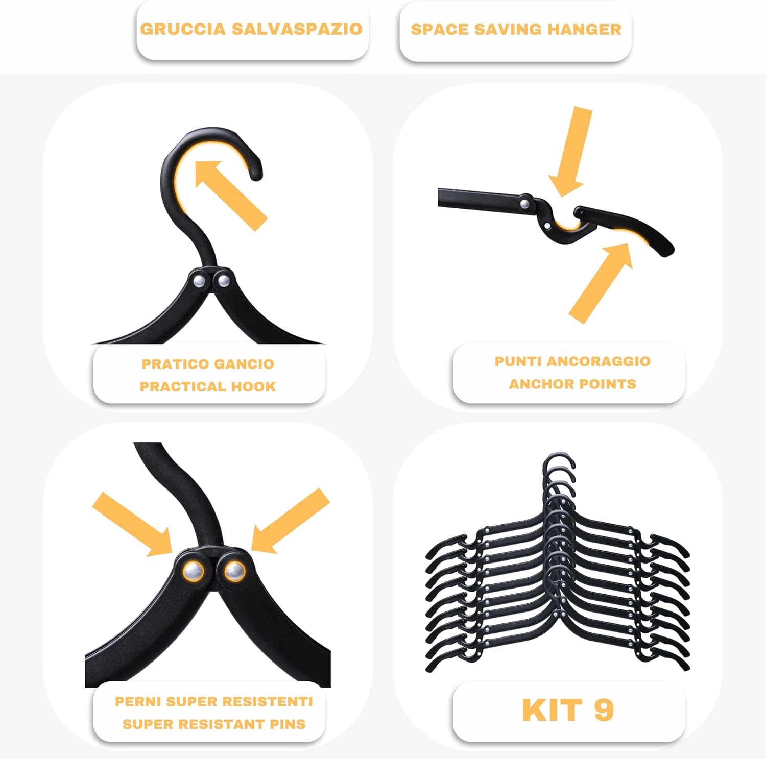 Grucce di discreta qualità. Sono comode da mettere in borsa soprattutto perché occupano pochissimo spazio, pratiche nell’utilizzo; nella parte finale di esse presentano un foro ambo i lati con la possibilità di mettere un cordoncino e appendere anche un pantalone nell’evenienza. Non le reputo robustissime, ci si può appoggiare una giacca di mezza stagione, un completo elegante(e ho i miei dubbi che regga) oppure un paio di camice, penso che con un giaccone invernale cedono subito quindi badate anche all’utilizzo che ne fate.Per il resto mi reputo comunque soddisfatto dell’acquisto e dell’utilizzo che ne dovrò fare. Arrivato in tempi rapidi, venditore disponibile.