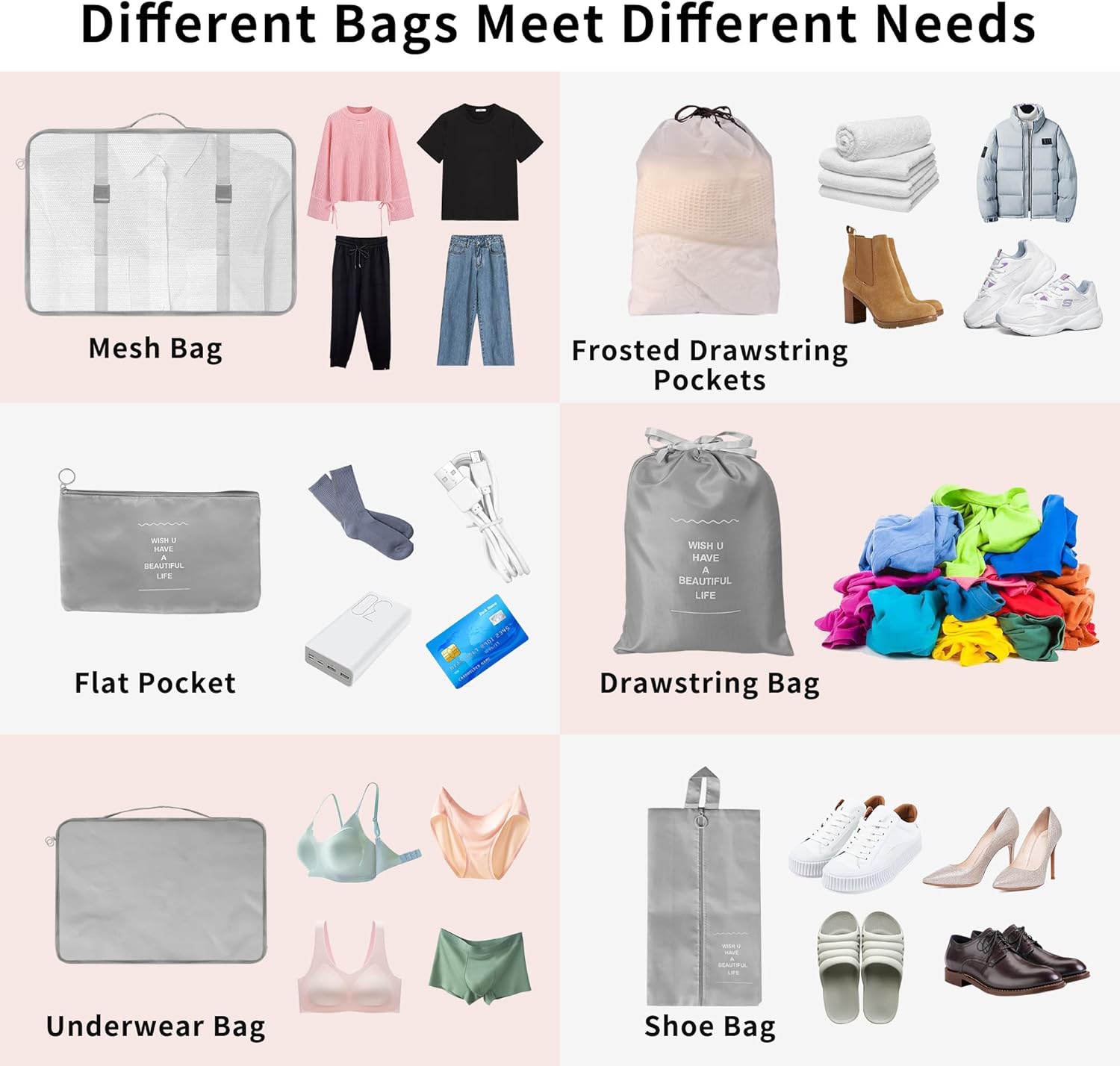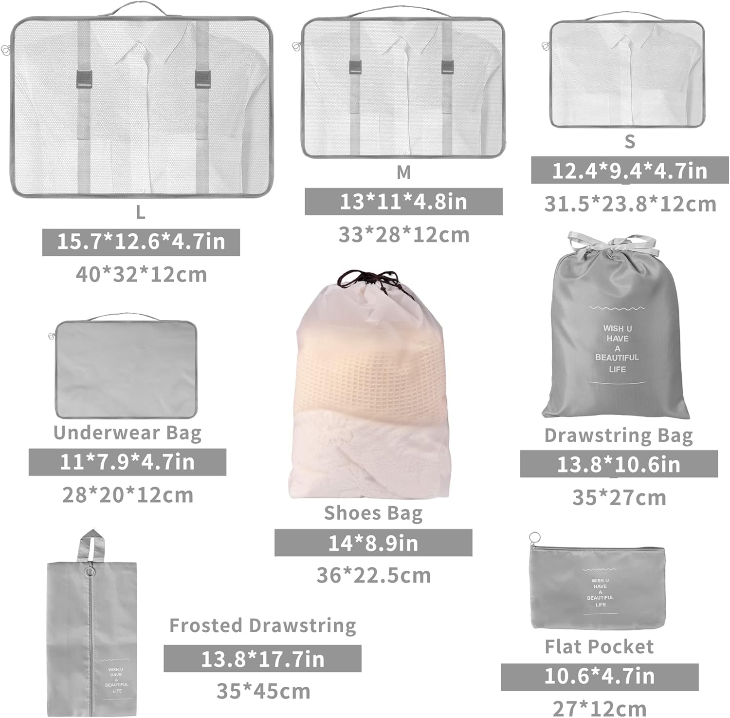 9 PIÉCES Emballage Cubes Organiseurs de Bagage: Comprend 3 sacs de télévision pour vêts, 1 sac à sous-vêtiments, 1 sac à chaussures, 1 cordon Les Chaussettes, Les Chaussures, Les Petits Accessoires, Les CosméTIQUES, Les Articles de Toilette, Les Serviets Humides, Le Linge Sale et Plus Encore.