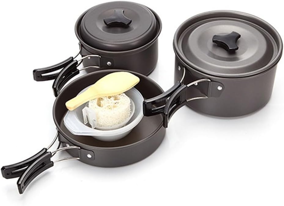(Kit de Cuisine de camping tout-en-un) Cet Ensemble comprend une poêle à frire, une Grande Casserole, une petite casserole, TROIS BOLS ET DES DES USENSILES Essentiels.