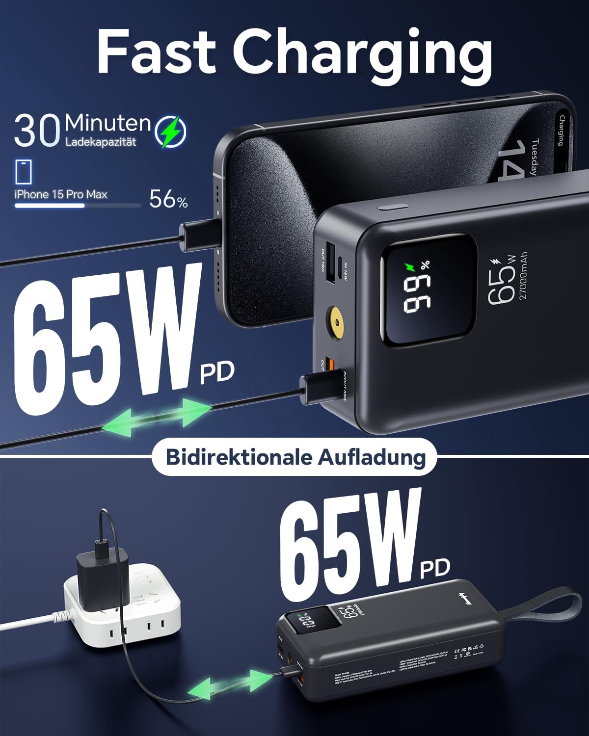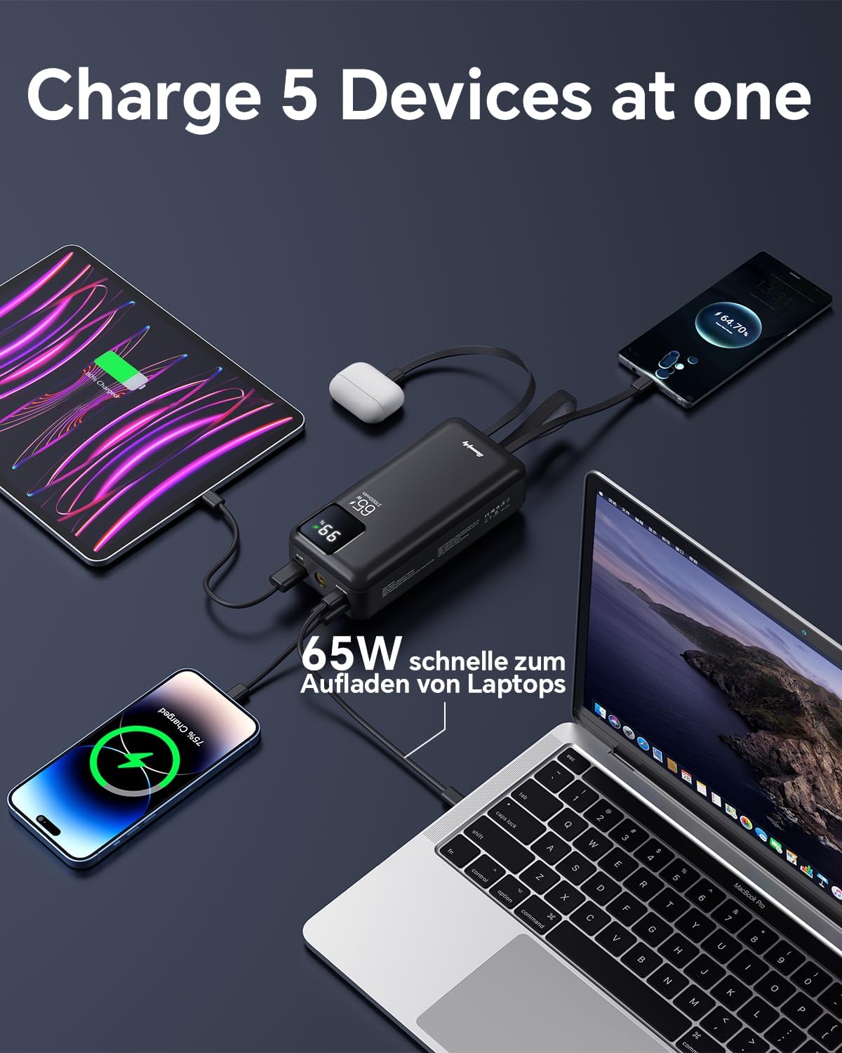 【65W TRAVAIL SUPPLESSE pour les ordinateurs portables】: CE Power Bank Portable Disser D’UNE TECHNOLOGIE AVANCEE DE VIESSE DE CHARGE AVEC UNE PUISSANCE D’ENTRÉE ET DE DE SORTIE ALLANT JUSQU’U 65W LET CHARGER Les Ornineurs Portables. Le Chargeur Portable Peut Recharger Un iPhone 15 Pro Max jusqu’à 56% en Moins de 30 minutes et un MacBook Pro Jusqu’à 45%, et la batterie externe Elle-Mâme Peut Être rechargee à 100% en selement deux heures. Parfait verser les situations D’Urgence: Rechargez Rapidation Vos Appareils et Gagnez du Temps en Moins des préposés.