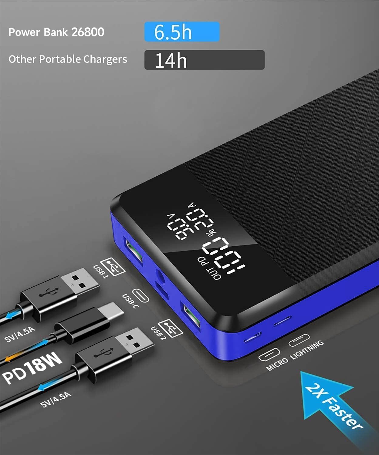 【Charge Rapide 22,5 WPD 25W ET 3 Entrées et triés】 Doté D’UNE SORTIE USB C PD FAST CHARGE MISE À JOUR, IL Peut Charger Votre Smartphone de 0 à 55% en 30 minutes. De Plus, CE Chargeur de TéléPhone Disser de 2 Trities USB. LE Chargeur Portable Peut Être Rechargé via 3 types d’entrées: ports USB C, Micro USB et Lightning.