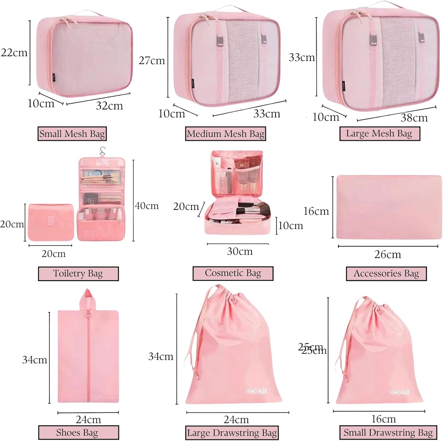 Nice little set of packing cubes. Expected some to be a little larger than they actually are. Could use these for a small suitcase or hand luggage. The shoe bag would probably be able to hold some sandals/flip flops.