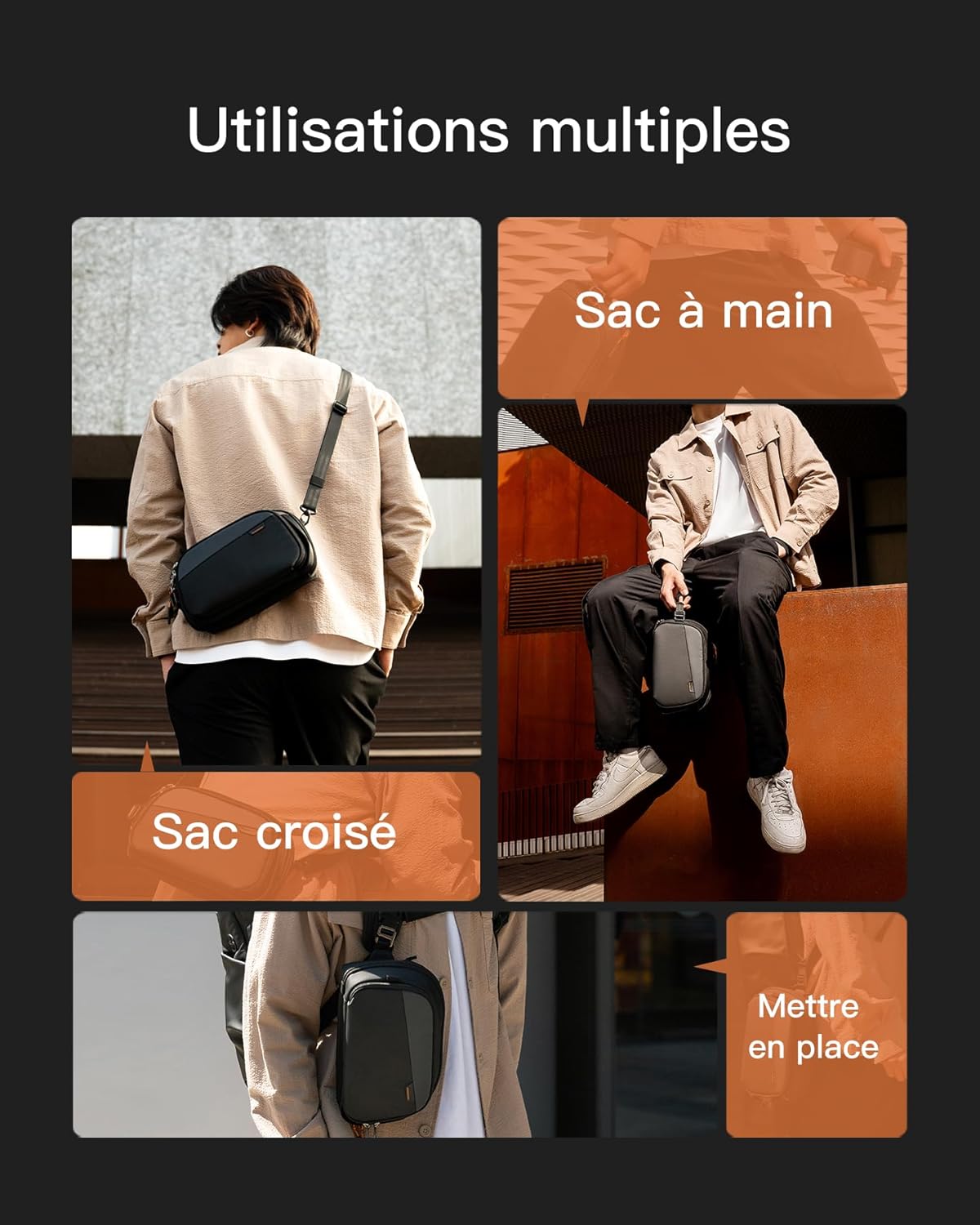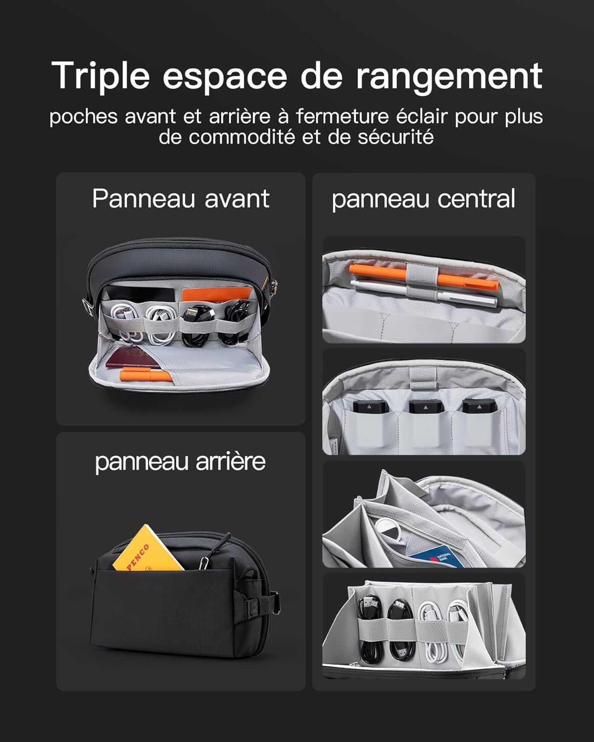 J’ai acheté ce sac pour pouvoir transporter avec moi des câbles, des adaptateurs, un chargeur, une souris, une batterie, un pointeur laser, un disque dur externe… En fait, tout ce dont j’ai besoin lorsque j’interviens pour une conférence. Mon objectif était de pouvoir glisser ce sac dans mon sac à dos ou de n’emporter que ce sac une fois que j’ai déposé mon sac à dos à mon bureau.Première impression à la réception du produit :J’ai été très agréablement surpris par la qualité de fabrication de ce sac. Il fait vraiment bonne impression !Avantages du produit :Encore une fois, la qualité de fabrication est excellente. Le matériau extérieur est agréable et qualitatif. J’ai apprécié l’ouverture complète à 180°, qui permet un accès facile à tout le contenu sans avoir à tout sortir. Les nombreuses poches et élastiques de maintien offrent de multiples possibilités de rangement et empêchent les câbles et autres petits objets de se mélanger. Il y a un bon maintien des accessoires. Les matériaux utilisés sont de bonne qualité, avec un tissu résistant aux éclaboussures et une fermeture éclair YKK. La bandoulière détachable est également un plus pour le transport. Une poche extérieure permet de ranger quelques objets. Deux poignées permettent de le tenir (une sur le dessus et une sur le côté). La bandoulière est une bonne idée.Points à améliorer :Le sac est un peu « épais » pour être facilement glissé dans des sacs à dos pas très grand. Cela pourrait être un inconvénient pour ceux qui voyagent léger. Il dispose de nombreuses possibilités de rangement, mais je doute que l’on puisse toutes les utiliser tout en conservant la possibilité de fermer le sac. Il faudra probablement éviter d’y mettre des objets plus encombrants que des câbles. De plus, la fermeture éclair n’est pas étanche, ce qui est dommage. La poche extérieure ne doit pas pouvoir contenir beaucoup de choses.Usages recommandés :Le sac est idéal pour transporter et organiser une grande variété d’accessoires électroniques, tels que des câbles, des chargeurs, des adaptateurs, et même de petits objets comme des disques durs et des clés USB. Je pense qu’il sera particulièrement utile pour les voyages longue distance, où l’on doit tout prévoir. Ainsi, à mon avis, c’est une excellente solution pour emporter en avion tous les petits accessoires dont on peut avoir besoin et que l’on souhaite garder à portée de main.Au global un très bon rapport qualité prix.