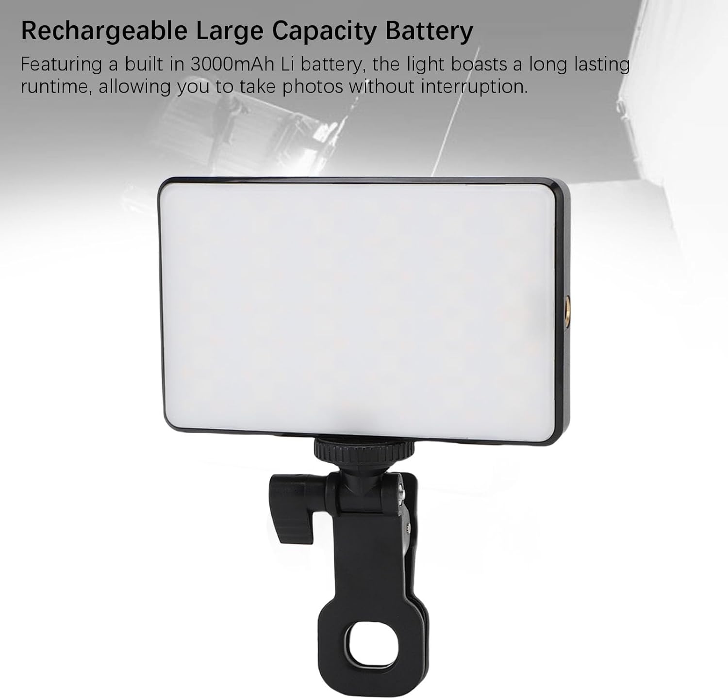 Batterie rechargeable de Grande Capacité: avec une batterie Integrée en 3000mah li, la lumière possède un temps d’expécution durable, vix permettant de prendre des photos sans interruption.