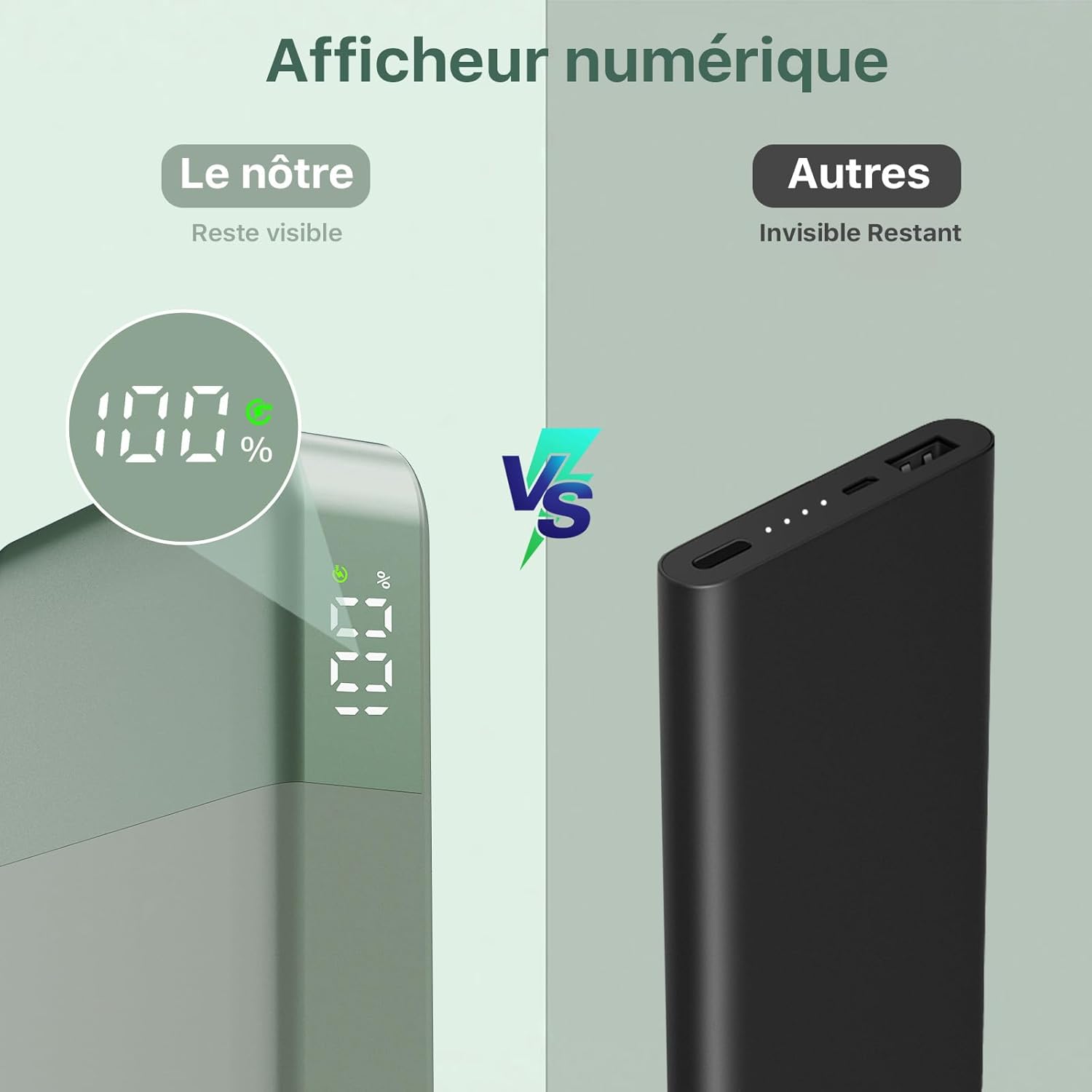 Affichage Numérique Intelligent: Le Chargeur Portable est Équipé d’Un Écran Numérique a conduit Intelligent de Haute Précision. La Précision de l’affichage de la Puissese est de 0 à 100%, ce qui facilite le Suisii de la Puissance Restante et Vous Permet de Recharger la Batterie externe Lorsque Vous en Ave Besoin.