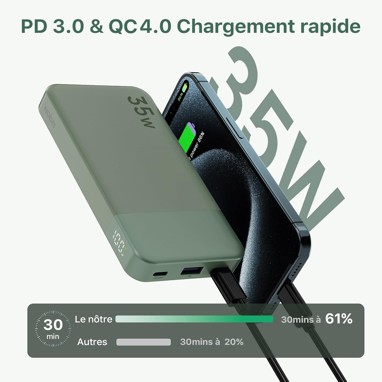 Chargement Rapide de 35W: LE Chargeur Portable Haute Vinesse de 35W une capacité de 10000mAH , AVEC Les capacités de charge Rapide PD 3.0 et QC 4.0 , combustez vore iPhone 15 à 61% ou un s22 ultra à 40,9% en passant 2,4a.
