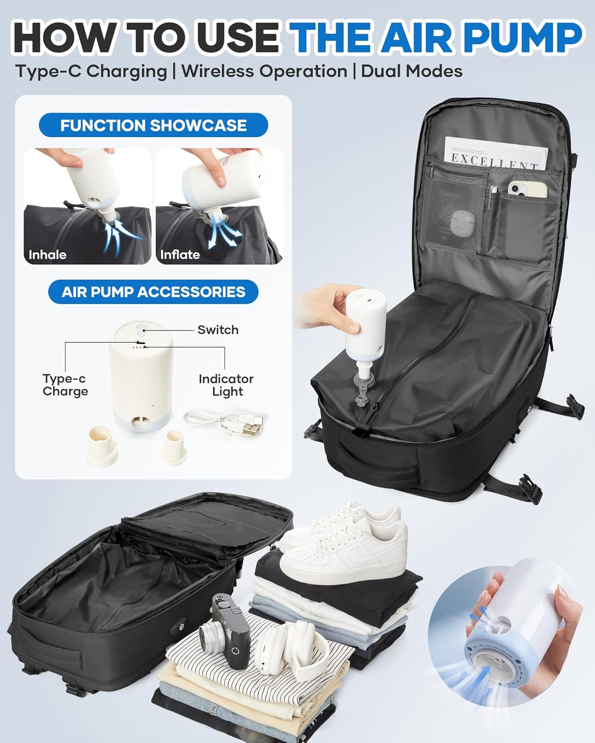 Der erste Eindruck war super. Leider war das nur der.Die Verarbeitung ist eher « schlampig » und die Beschreibung verspricht mehr als der Rucksack dann tatsächlich hält.Auch die Pumpe (ist zwar laut) aber die Leistung ist eher nicht so hervorragend und man ist selber schneller dran.Einige Fächer sind total nutzlos. Das Fach für die Schuhe kann bei einem « vollem » Rucksack (Klamotten für 4Tage) nicht genutzt werden und das auch bei kleinen Schuhgrößen.Die Idee ist gut, an der Umsetzung kann noch gearbeitet werden.Ich würde ihn nicht nochmal kaufen.
