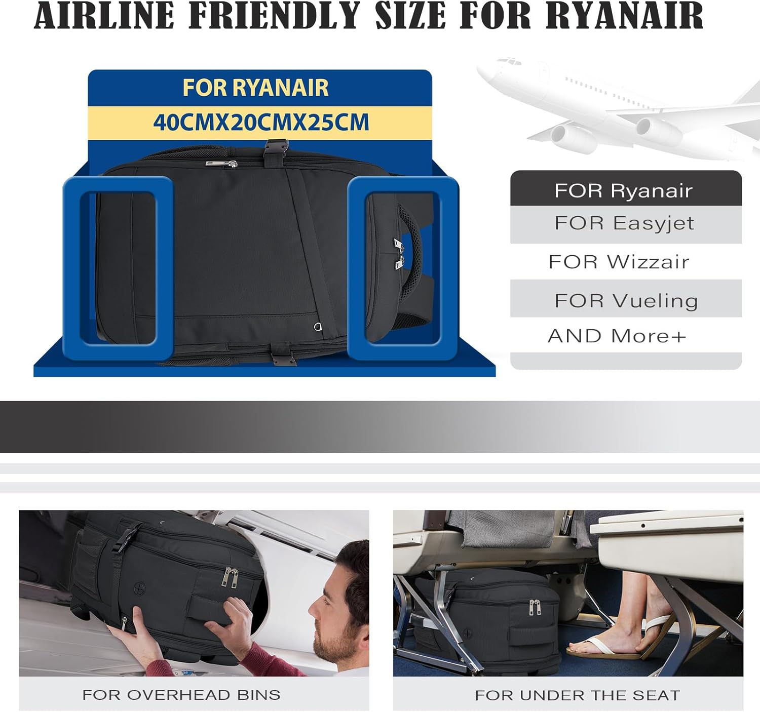 Sac à dos pour Ryanair: le sac à dos de cabine hayayu mesure 40x20x25cm et une capacité de 20l. Ce sac à dos de voyage peut facilitation Être placé sous le siège de la cabine ou aussus de la cabine pour avoir terminé adieu aux fais de bagages Supplémentaires, et il est le spéciale conçu pour les sacages Aérinnes. Par exemple, une compagnie aérienne avec un bagage à main 40x30x20cm