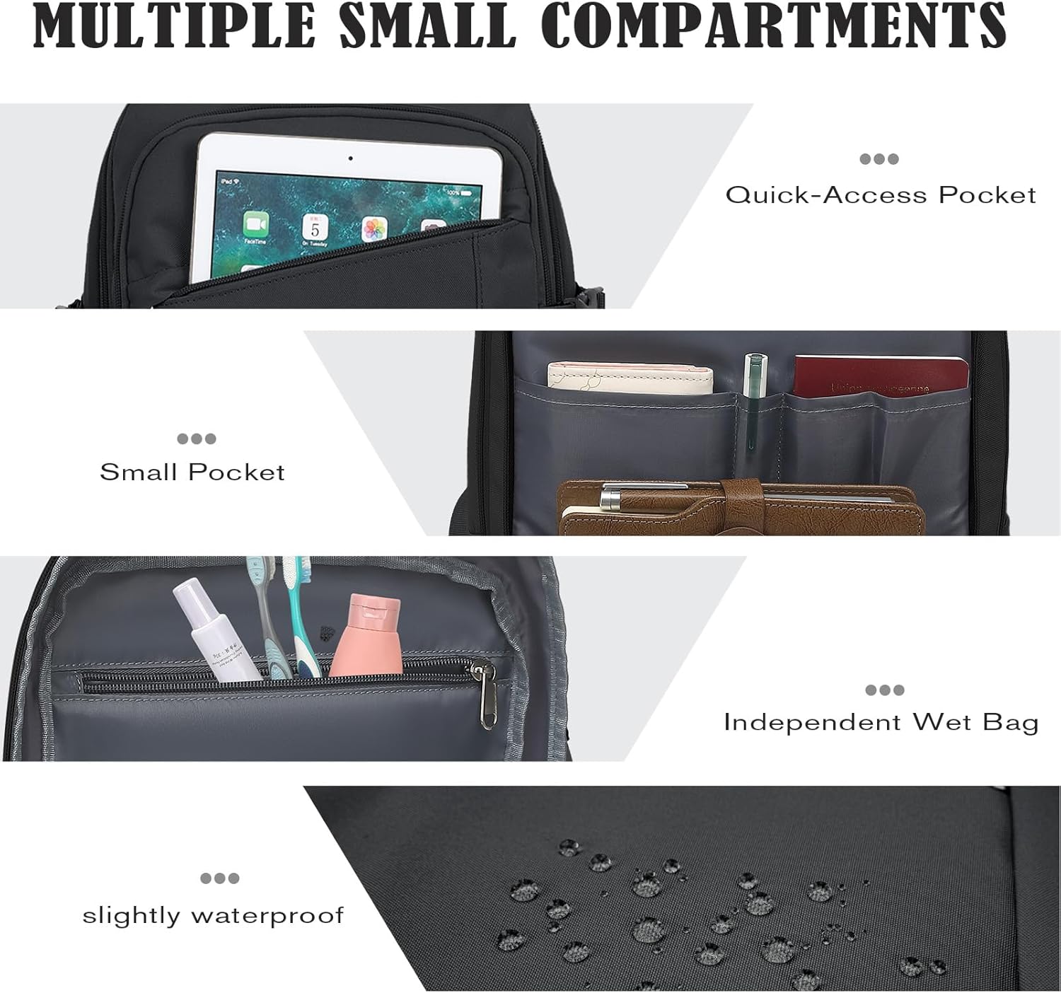POCHES ORGANISES: Le Compartiment Principal du Sac à Dos est équipé D’UNE BOUCLE LE FISTER Les Bagages, Idéal pour Ranger des Vêts, des Livre, etc. Pendant le Voyage, le Compartiment du Milieu a Queques Petits. Le sac à dos est conçu Avec un peu poche zippée à L’Avant pour un accès de rapide et un et un compartiment sepaté pour l’ordinatur de 14 pouces et un de poche antivol à l’arrière du sac