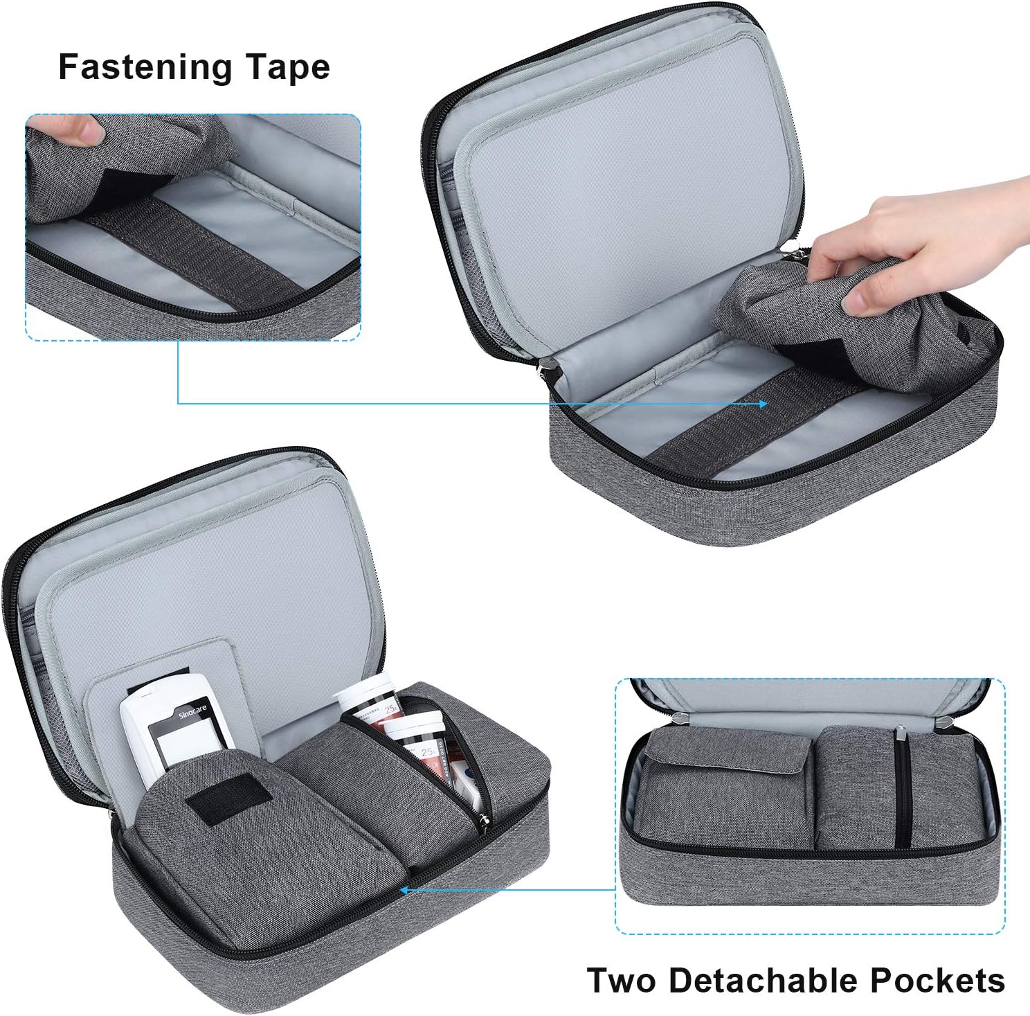 ✔Compément de stockage des quatrenitures de test diabétique – la couche supérieure avec 2 zippé poches est conçue couler le leceneur de glycémie, le stylo autopicienur, les bandelettes de glucomètre et d’autres accessoires de test diabétique.