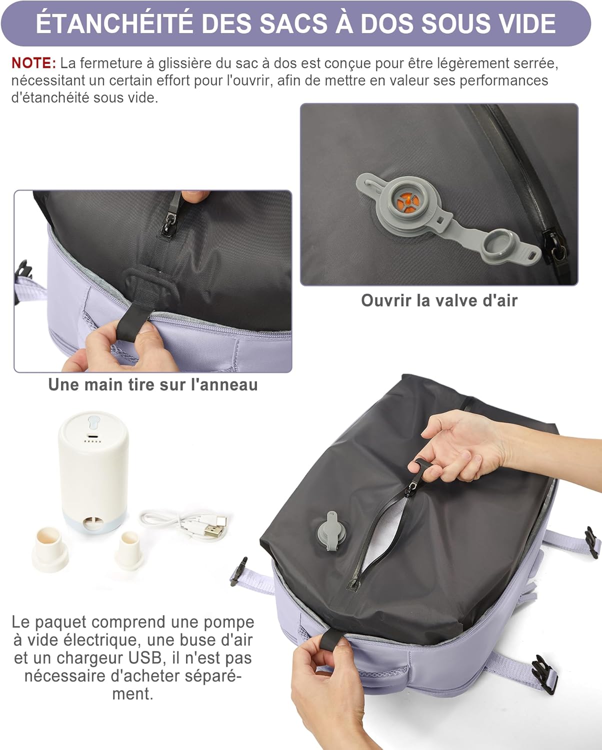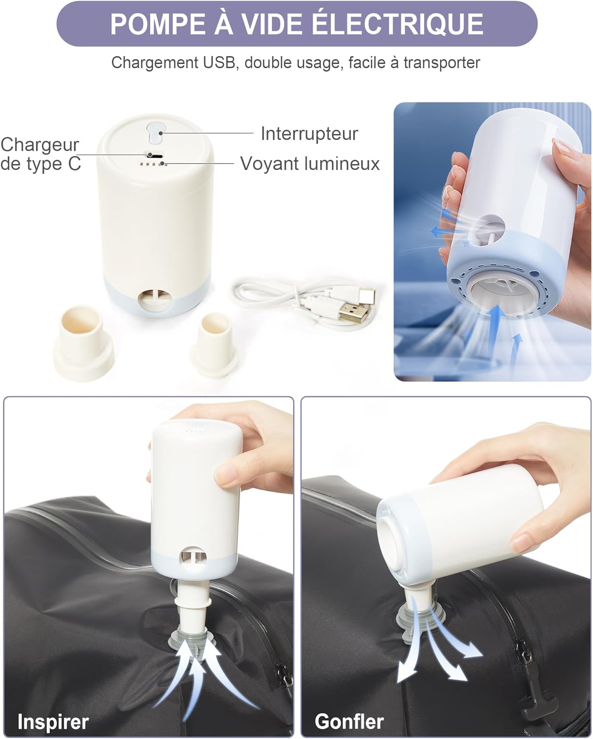 Sac à dos à vide de Voyage Avec Pompe: il n’est pas Nécessaire d’Acheter ce Produit Séparément, il est Livré avec unpe Pompe à vide. La Pompe à Vide Peut Être utilisée pour la compression et le gonflage Sous vide des embouts correspondants pour les différences. Vers l’utilisateur, double cliquez sur l’Interrupteur pour la Démarrer et Cliquez sur l’Interrupteur pour l’Éteindre (la pompe à vide Fait Beaucop de Bruit Lorsqu’elle Fonctionne, Si cela Vous DÉRANGE, NE L’ACHETEZ PAS)