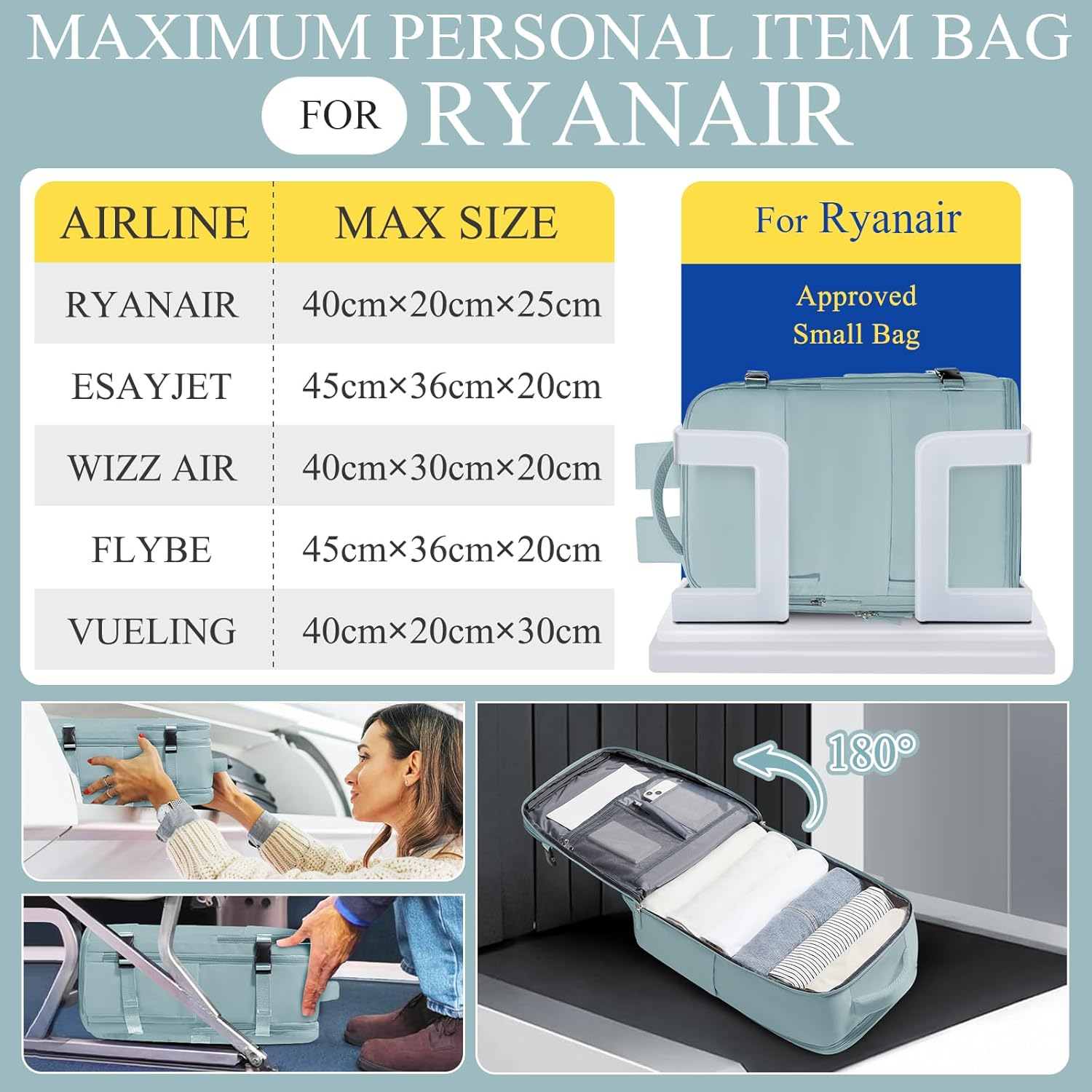Je prends souvent l’avion pour des séjours de 3 ou 4 jours, via des compagnies low-cost. Ce sac a le format idéal pour ne pas payer de bagages cabine ou soute. Encore mieux utilisé avec des sacs de compression.