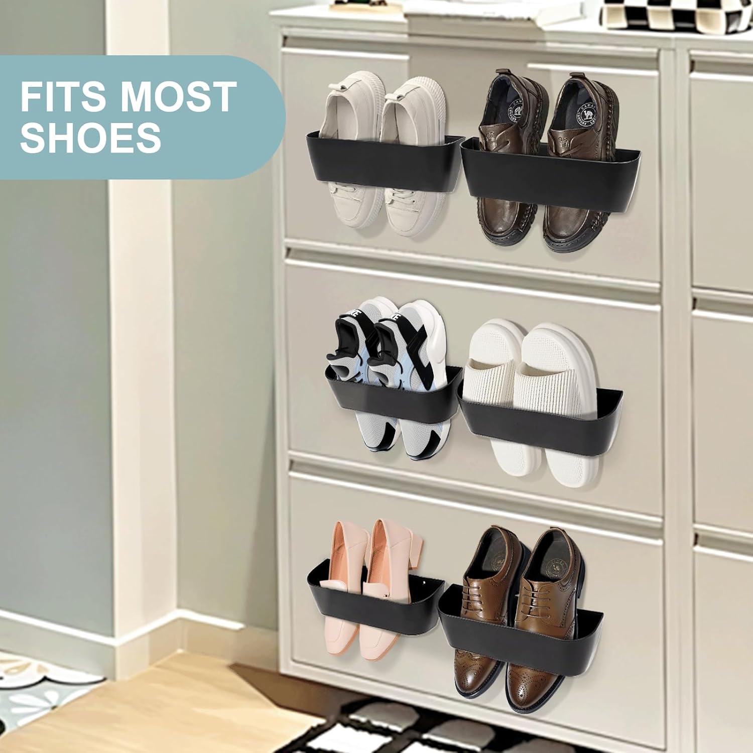 【Facile à l’installateur】 — Notre Support de Chaussures en plastique est facile à installer et propose deux Méthodes à l’installation: A: Auto-adhésif. Il suffit de netoyer et de sécher la Surface Cible, de décroller le film protecteur sur les crochets adhésifs sans couture et le support à chaussures peut Être installé installé 12 heures. B: Perçage: Percez des trousses dans les surfaces raconte que le papier peint et les murs peints.