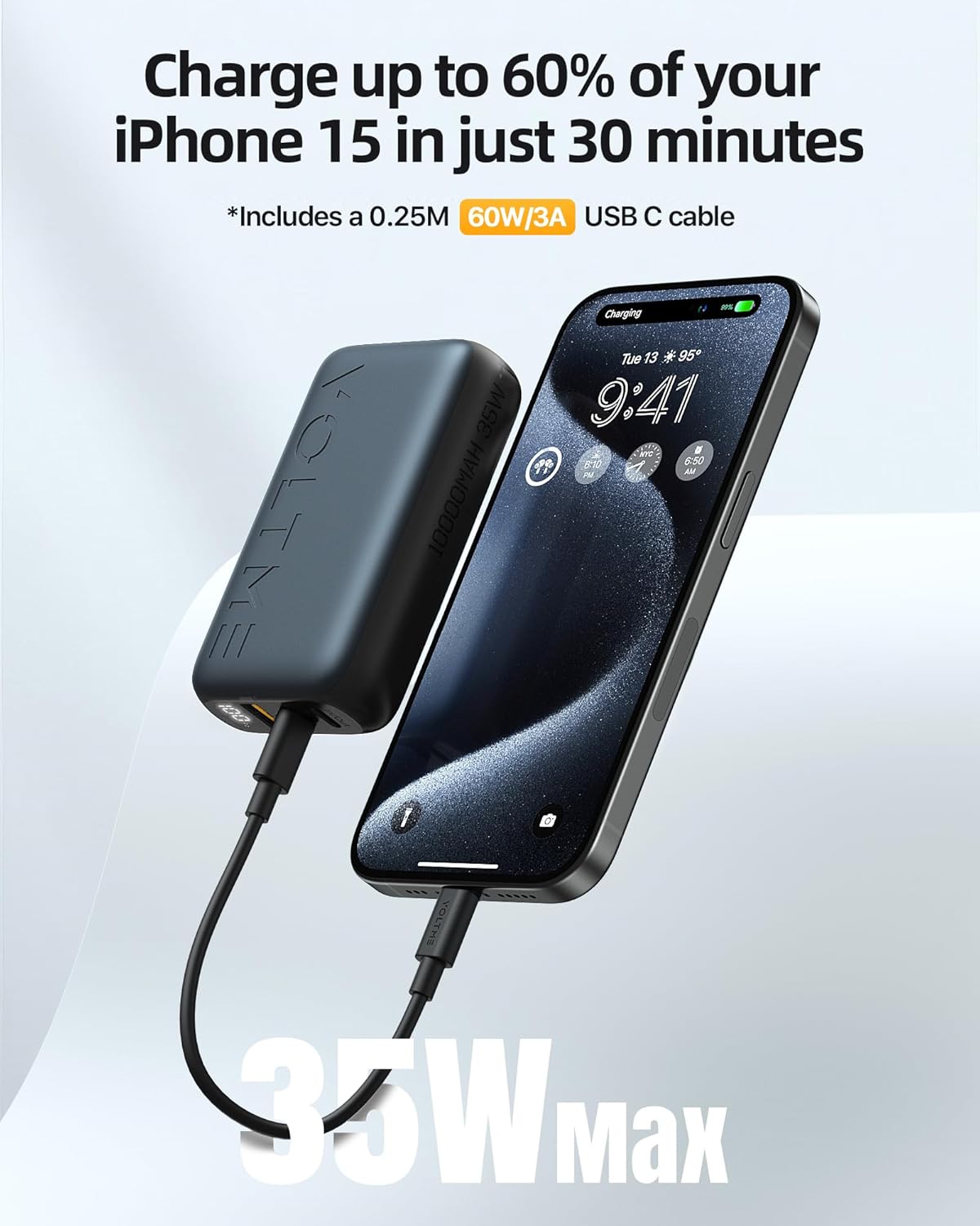 Power Bank da 10,000mAh con due porte USB-C e una USB 3.0 con capacità fino a 35W e quindi utile anche per i più moderni smartphone e tablet.Sfruttando circa il 20% di carica mi ha permesso di ricaricare un iPhone 13Pro del 60% in circa un quarto d’ora, notevole e utile!Sul lato ha un tasto giallo che permette di mostrare la carica del powerbank attraverso dei led ben visibili.Unico neo, per cui 4 invece di 5 stelle, i led rimangono sempre accesi durante la carica, contribuendo seppur in minima parte al consumo della stessa e a produrre una luce che in ambiente buio può risultare fastidiosa.Il power bank non è sottilissimo, ma è comunque compatto e comodo da tenere in una mano.Il costo non è altissimo per cui i prodotto è APPROVATO!!!