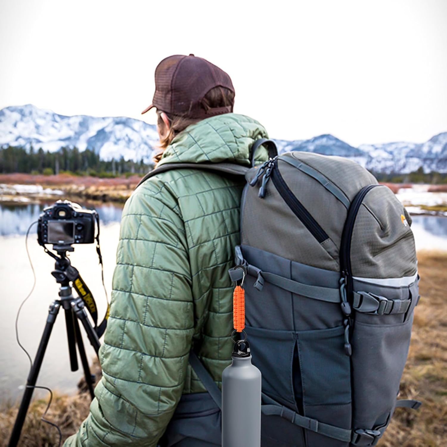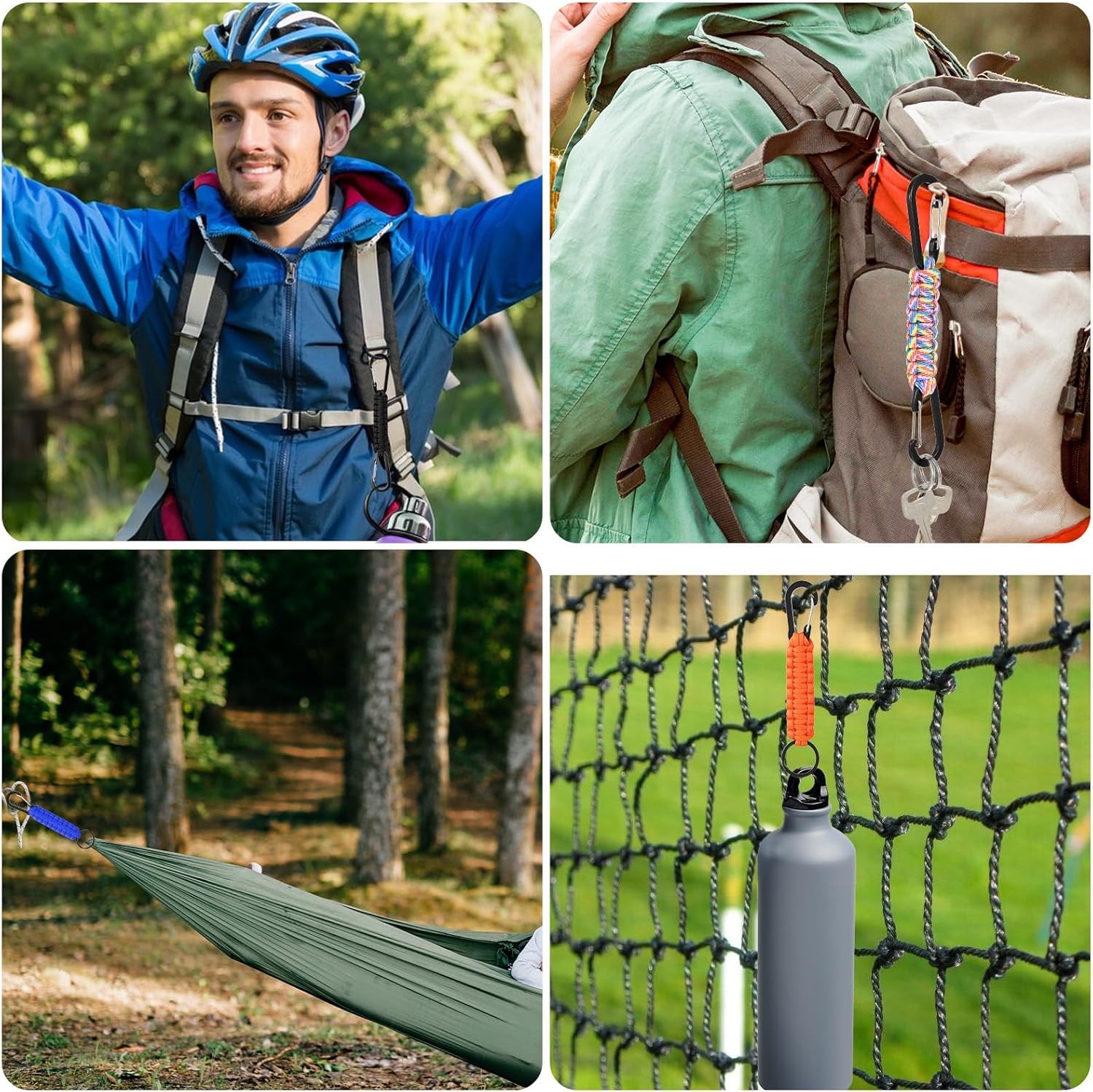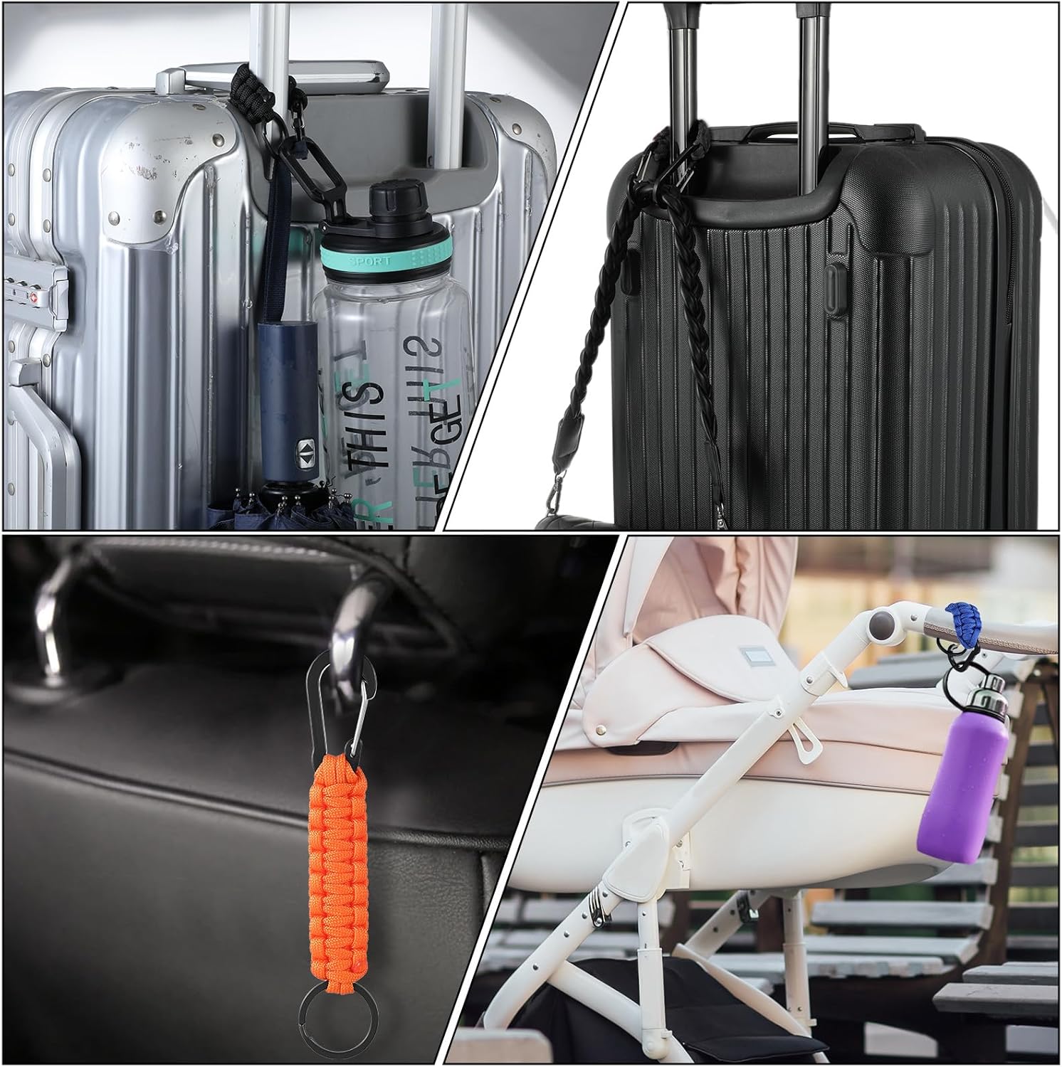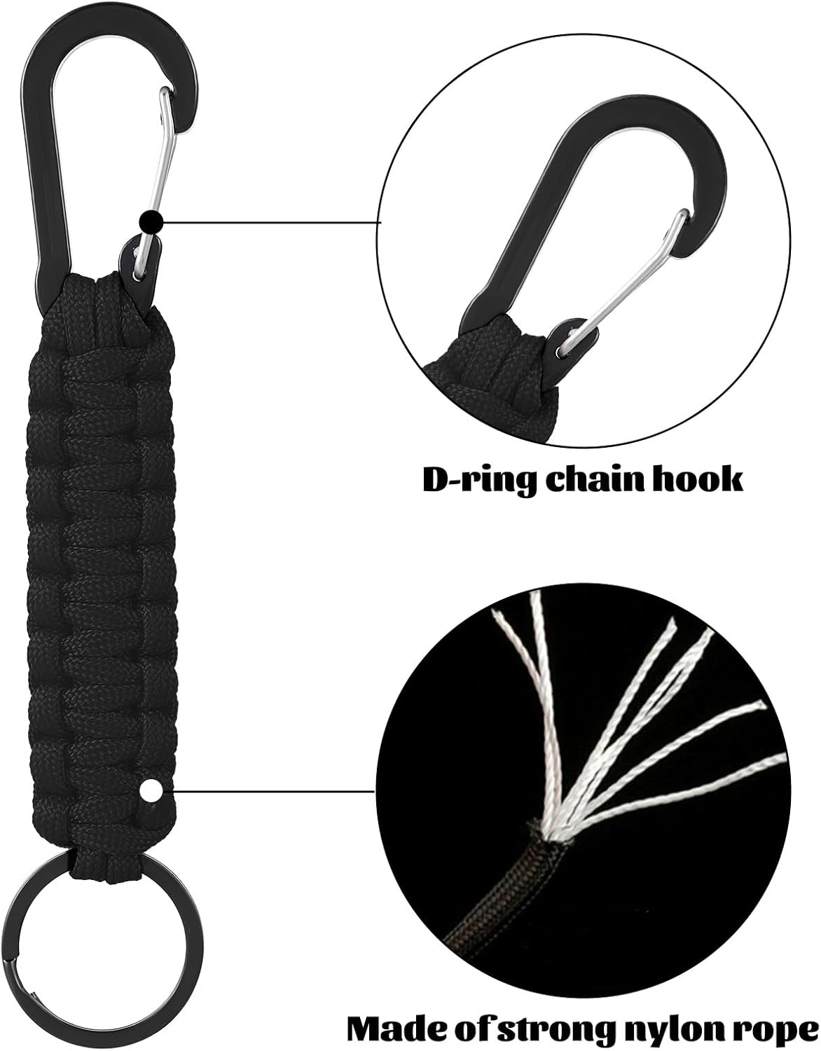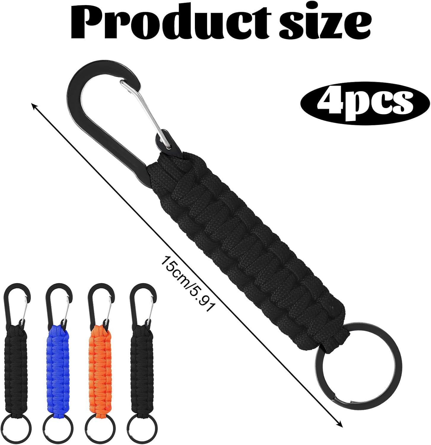 These paracord have a spring clip carabiner at one end and a keyring at the other. The paracord is sturdy, however, it cannot be stretched. They work well to organize household and vehicle keys. The paracords can also be used to attach to a backpack to carry a variety of items or for use with camping accessories.