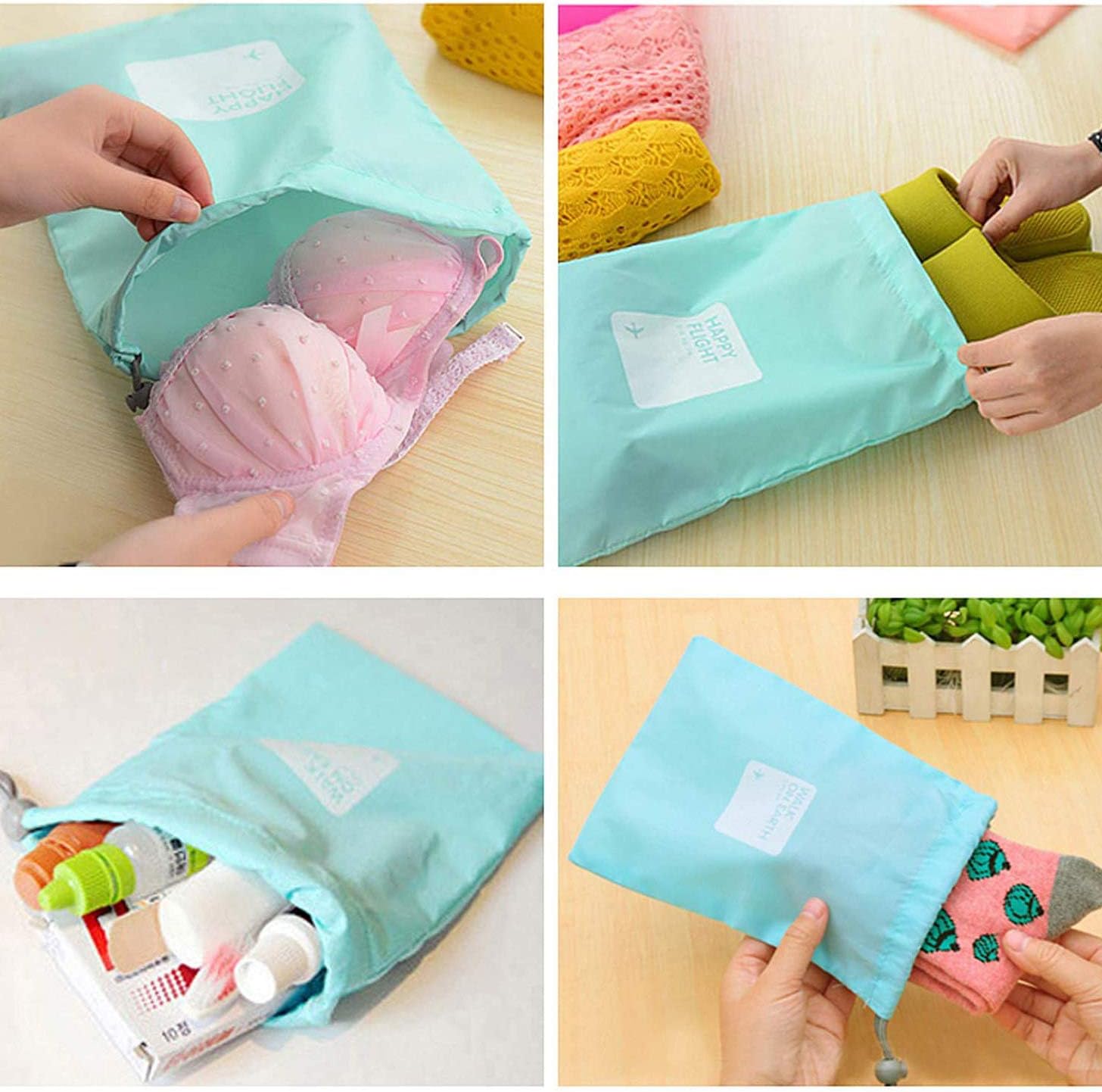 Des sacs de rangement très pratiques mais autant le plus grand paraît parfait pour une paire de chaussures, autant je ne vois pas bien à quoi servent les plus petits, surtout les deux derniers. Comme sac à linge sale c’est pareil c’est un peu trop petit.Les cordons de serrage sont épais et solides.Un produit pratique en soi mais sans réel intérêt sauf si vous avez des très petites choses à isoler dans une valise.